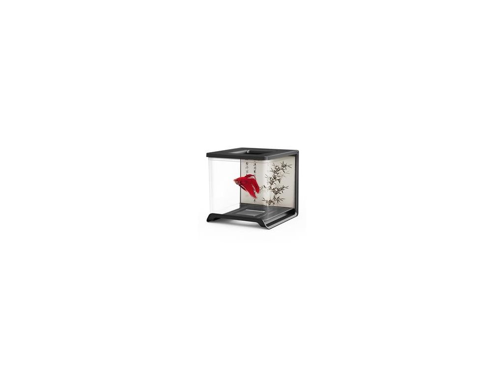 plastová nádržka s odklopným vrchom a otvorom na kŕmenieí • vymeniteľné pozadí (4 scenérie) • možno pripevnit i na stenu (úchytný systém nnie je súučásťouí balení) • objem 1,8l